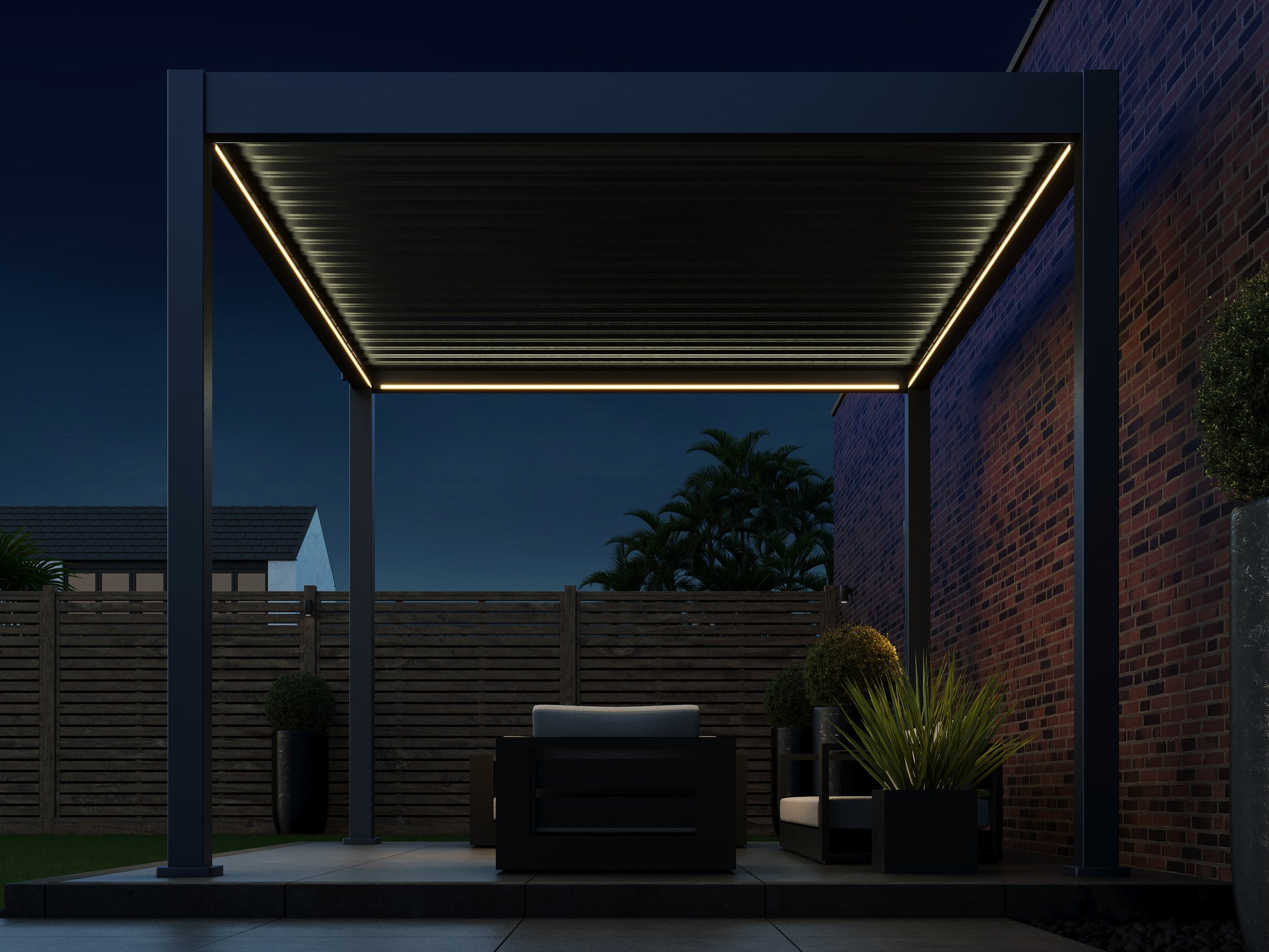 Make the most of your outdoor living space with pergola LED lights that let you enjoy your louvered pergola from morning to night.