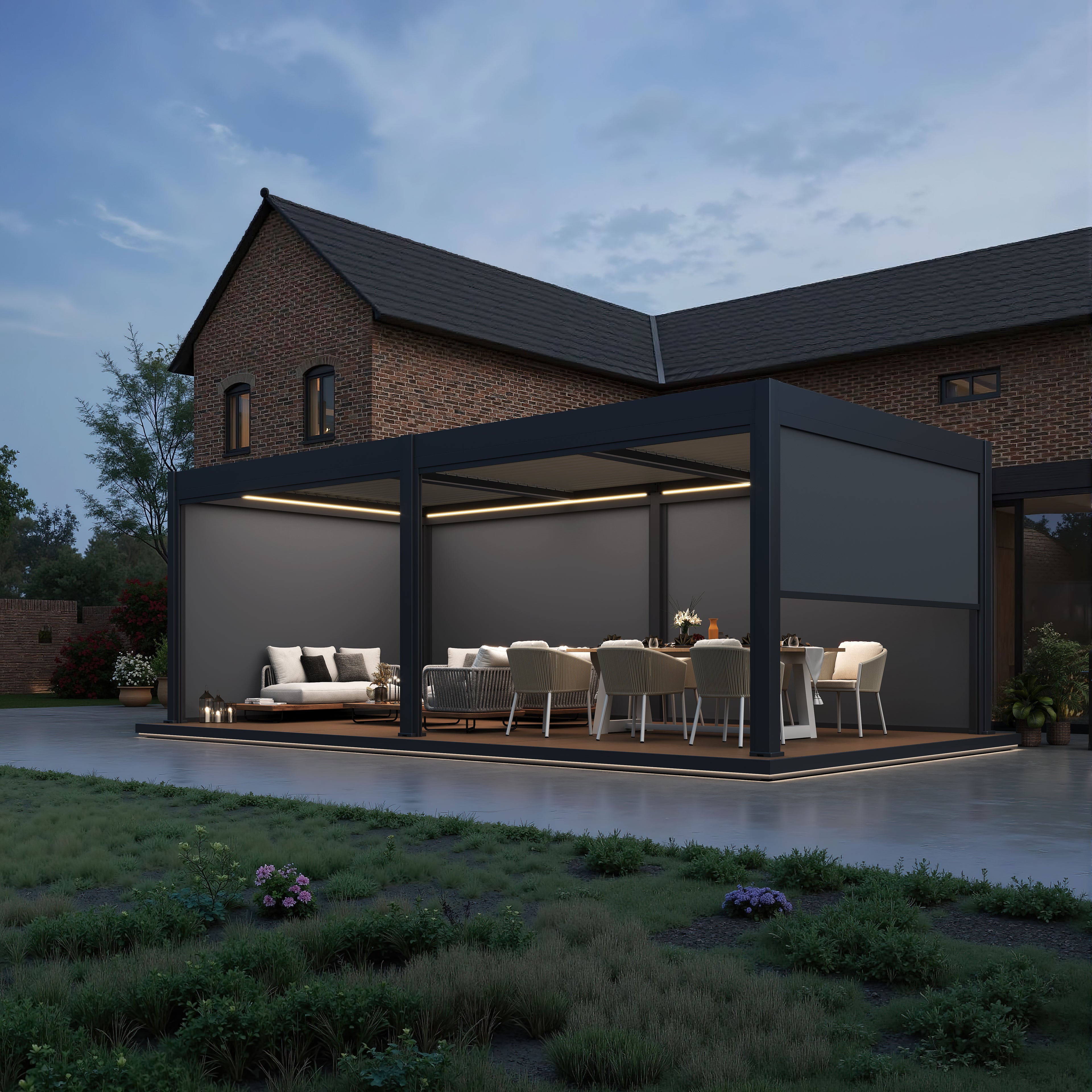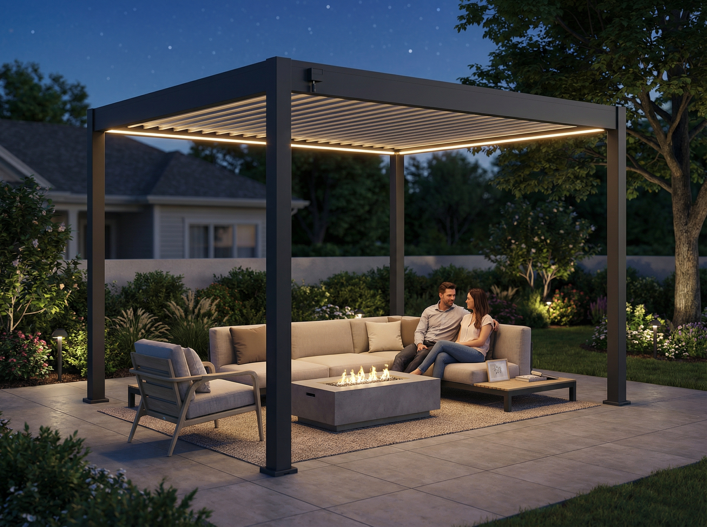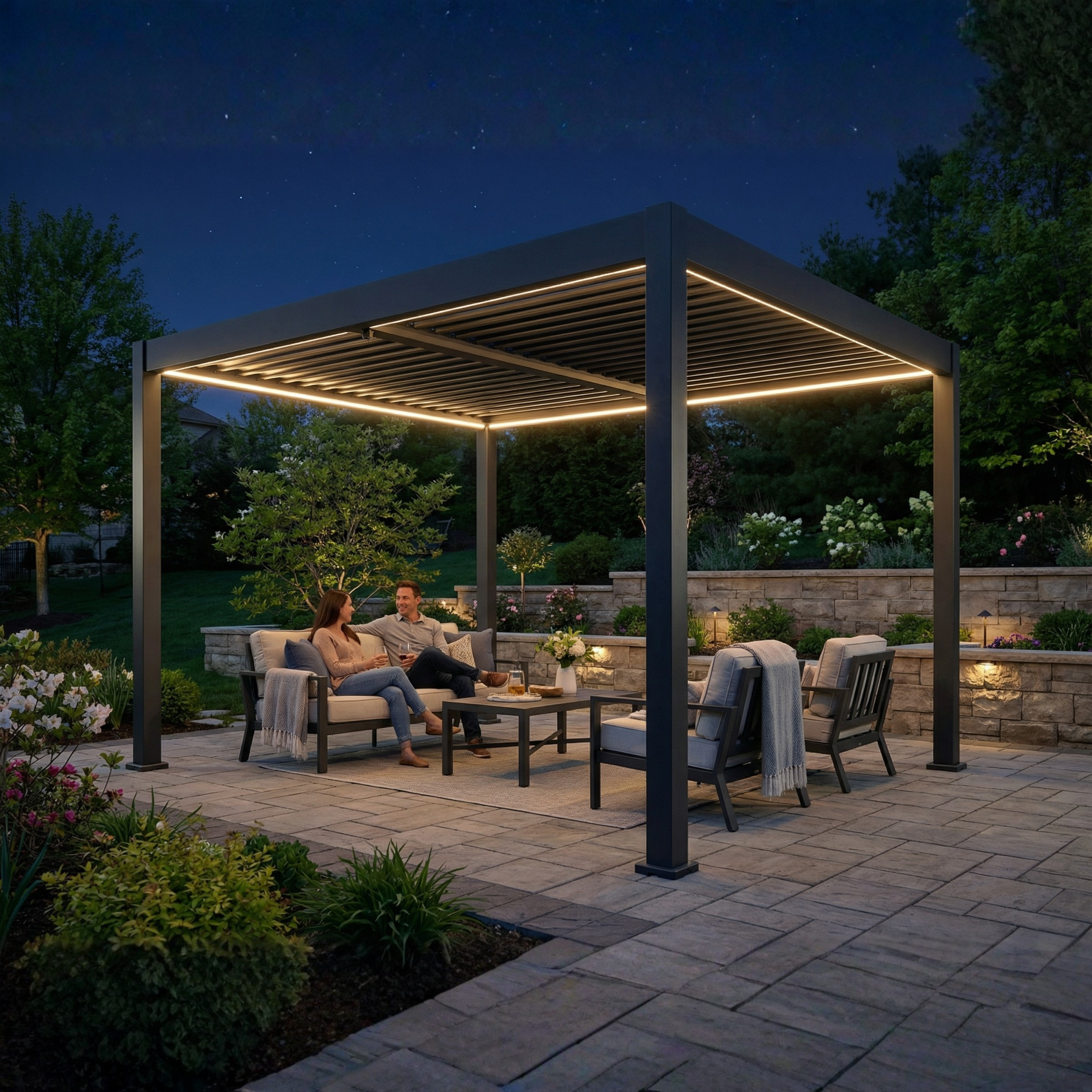 The RGBW LED system offers a full color spectrum plus warm white light, giving you complete control over your pergola's ambiance.