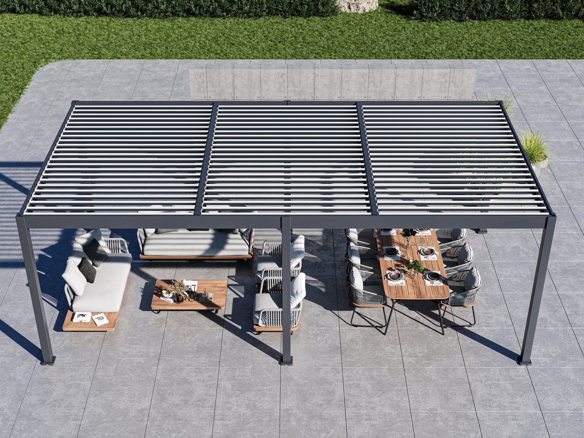 Featuring six posts and two central support beams, this configuration offers three independent louver zones with added strength and stability—ideal for larger outdoor spaces.